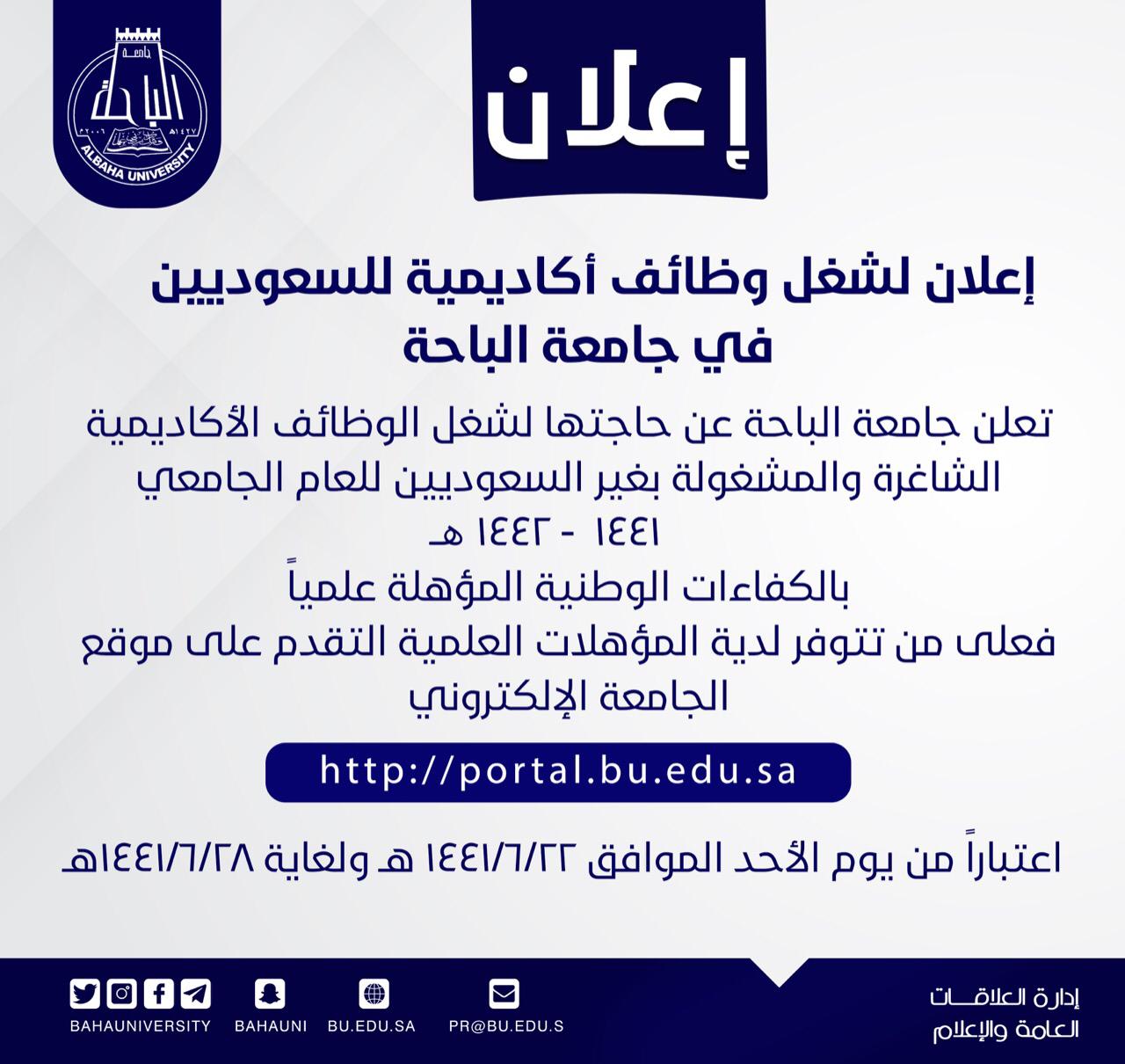 جامعة الباحة على تويتر إعلان تعلن جامعة الباحة عن حاجتها لشغل الوظائف الأكاديمية الشاغرة والمشغولة بغير السعوديين للعام الجامعي 1440 1441هـ بالكفاءات الوطنية المؤهلة علميا فعلى من تتوفر لديه