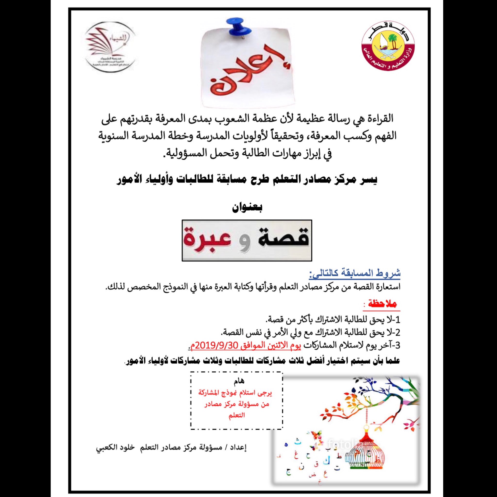 O Xrhsths الشيماء الثانوية Sto Twitter يسر مركز مصادر التعلم بالمدرسة طرح مسابقة ثقافية للطالبات و أولياء الأمور الأفاضل بعنوان قصة و عبرة كل الشكر للأستاذة خلود الكعبي مسؤولة مصادر