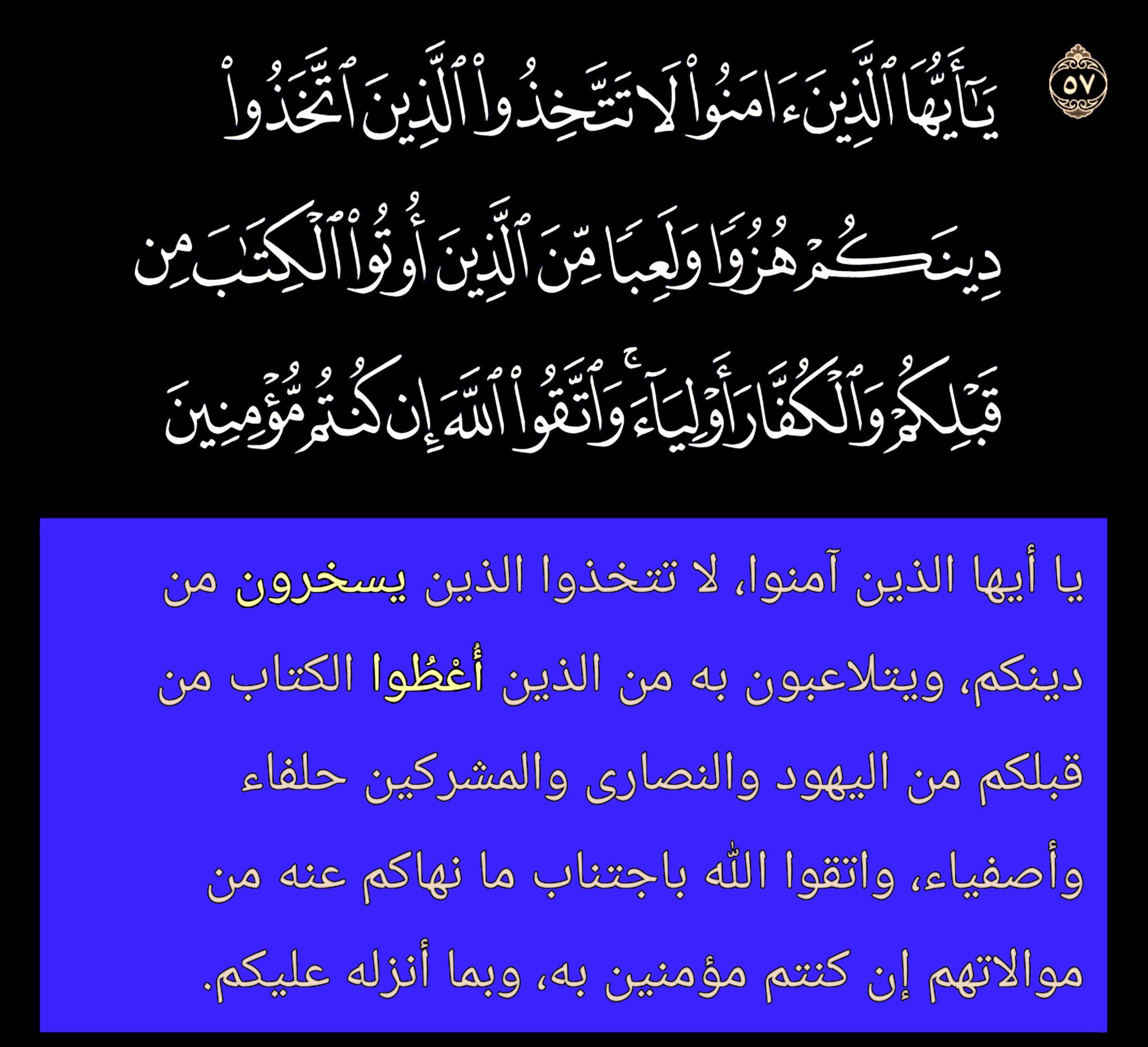 ي ا أ ي ه ا ال ذ ين آم ن وا ل ا ت ت خ ذ وا ال ذ ين ات خ ذ وا د ين ك م ه ز و ا و ل ع ب ا م ن ال ذ ين أ وت وا ال ك ت اب م ن ق ب ل ك م و ال ك ف ار أ و ل ي اء و ات ق وا الل ه إ ن ك ن ت م م ؤ م ن ين تفسير الجلالين المائدة 57